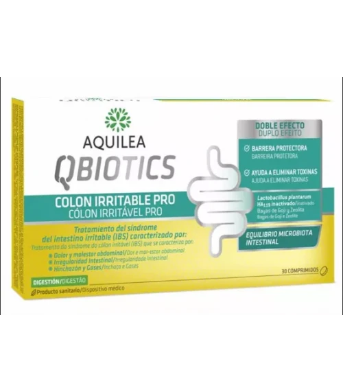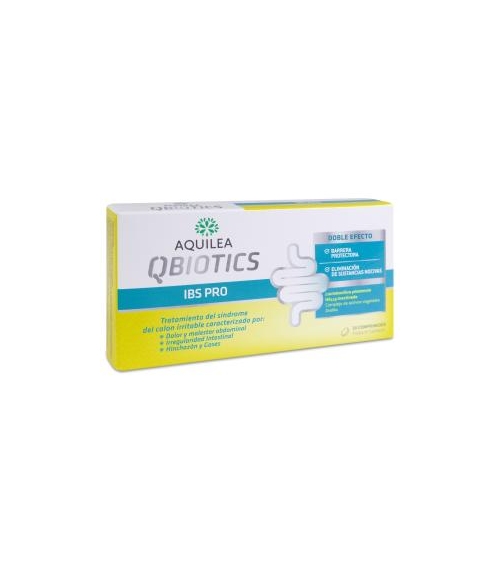 ¿QUÉ ES Y PARA QUÉ SIRVE AQUILEA QBIOTICS IBS PRO 30 COMPRIMIDOS? Se trata de un producto sanitario en cuya composición encontramos probióticos como Lactobacillus plantarium HA- 119 tindalizado, un complejo vegetal (formado por una mezcla de mucílagos extraídos de Aloe y Altea), Zeolita, manzanilla y aceite esencial de hinojo y alcaravea. A base de dichos compuestos, de origen natural, Aquilea Qbiotics IBS Pro 30 Comprimidos hace uan doble función en el intestino dañado por enfermedades como el colon irritable, el síndrome de intestino irritable, en personas sin enfermedad diagnosticada pero con problemas digestivos frecuentes... Por un lado, forma una barrera protectora gracias a los mucílagos, formando una barrera que se adhiere firmemente a la mucosa intestinal, ayudando a defender dicha barrera natural. Por otro, evita la absorción de sustancias nocivas ya que hace que la barrera sea mucho más restrictiva a la hora de absorber sustancias, evitando que entren ene l organismo y provoquen daños intestinales. Y aún más: manzanilla, zeolita, hinojo y alcaravea son sustancias usadas de forma tradicional con un notable éxito para el tratamiento de distintos síntomas molestos durante la digestión como dolor de tripa, gases, excesiva motilidad intestinal... ¿CÓMO DEBEMOS TOMARLO? La recomendación es de 2 comprimidos al día con las principales comidas. En caso de mayores molestias se puede hasta duplicar la dosis, tomando dos comprimidos en el almuerzo y otros dos en la cena. Para el mantenimiento, se reduce la toma a un comprimido diario si las molestias desaparecen o son muy leves.
