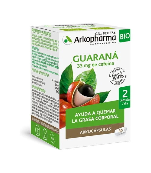 Arkocápsulas® Guaraná BIO 80 Cápsulas es un complemento alimenticio a base de Guaraná de cultivo certificado bio que contribuye a estimular el metabolismo, produciendo en el cuerpo un mayor consumo de grasas, especialmente las acumuladas, por lo que su ingesta lleva a una pérdida de la grasa localizada. Es para usar en casos de decaimiento físico o intelectual o en dietas de adelgazamiento.