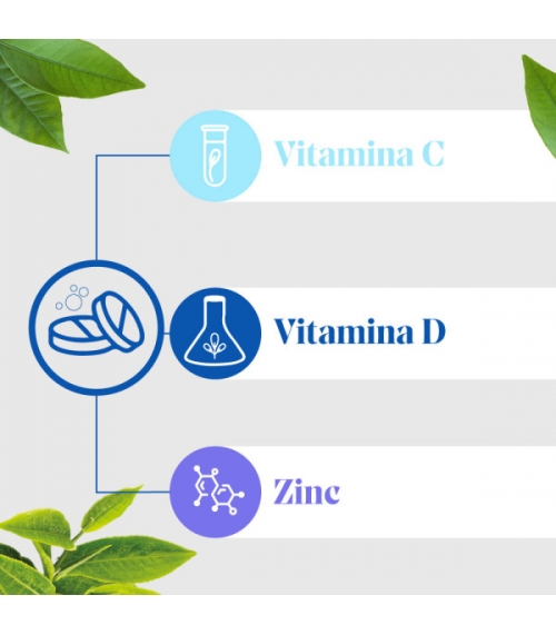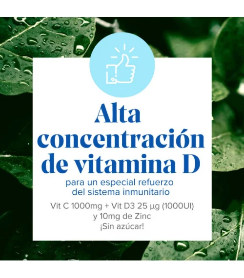Es un complemento alimenticio a base de Vitaminas C, D y Zinc que contribuyen al funcionamiento normal del sistema inmunitario. Contiene edulcolantes y no lleva azúcares.