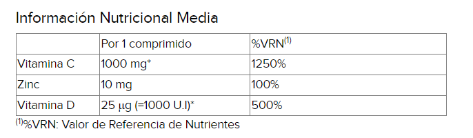 En total, contiene 1 g de vitamina C, 1000 UI de vitamina D3 y 10 mg de Zinc, con lo que las necesidades diarias están más que cubiertas, aunque recomendamos nunca descuidar la ingesta diaria mejorando en lo posible nuestra alimentación diaria.