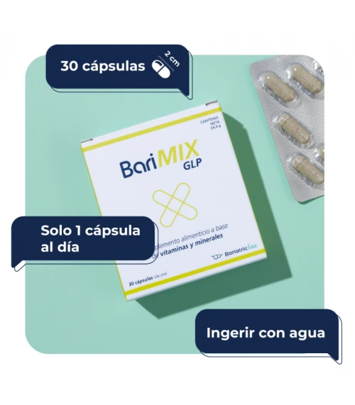 Barimix GLP 30 Cápsulas se presenta en un envase que contiene 30 cápsulas. Esto corresponde a un suministro para un mes, favoreciendo así la consistencia en el uso diario del producto.