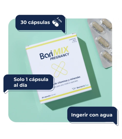 **Barimix Pregnancy 30 Cápsulas** es un complemento alimenticio especialmente diseñado para mujeres embarazadas. Con una combinación única de vitaminas y minerales esenciales, apoya el desarrollo sano del bebé durante toda la gestación. Este producto cubre las necesidades nutricionales diarias que son fundamentales durante el embarazo y contribuye al bienestar general de la madre. Cuando buscas un aliado saludable y eficaz para un embarazo sin complicaciones, **Barimix Pregnancy 30 Cápsulas** se presenta como una opción ideal.