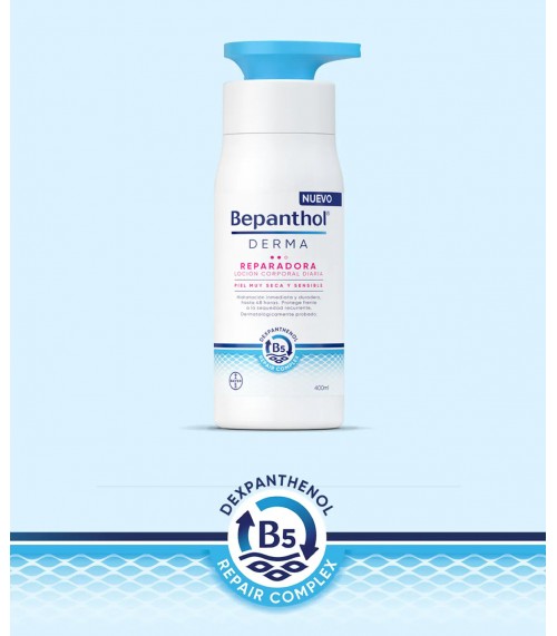 ¿QUÉ ES Y PARA QUÉ SIRVE BEPANTHOL DERMA REPARADORA LOCION CORPORAL DIARIA 400 ML? Para pieles que se resecan con facilidad y llegan a descamarse, enrojecerse y, finalmente, picar y molestar mucho. La crema hidratante Bepanthol Derma Reparadora Loción Corporal Diaria 400 ml consigue recuperar la piel dañada por la sequedad tras varias aplicaciones. No sólo eso sino que, además, prepara la piel para que sea cada vez menos frecuente esa situación. Lleva lípidos naturales (procedentes de la naturaleza como el aceite de argán o la manteca de karité) y fisiológicos (presentes de forma natural en nuestra piel), así como dexpantenol, glicerina o vitamina B3 o niacinamida, que forman una mezcla patentada que es la Repair Complex, que desde el interior de la piel, en las capas más internas, repara y arregla para recuperar la uniformidad y evitar pérdidas hídricas. ¿CÓMO DEBEMOS USARLA? Aplicar generosamente sobre todo el cuerpo cada día, tantas veces como sea necesario. PRECAUCIONES Y ADVERTENCIAS No utilizar en caso de alergía a algunos de los ingredientes de este producto.