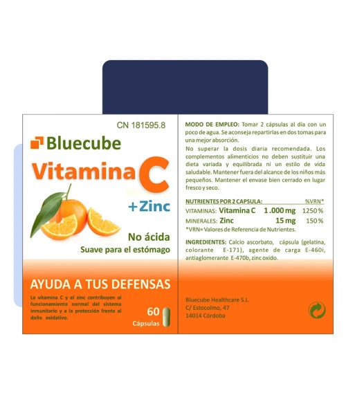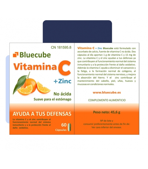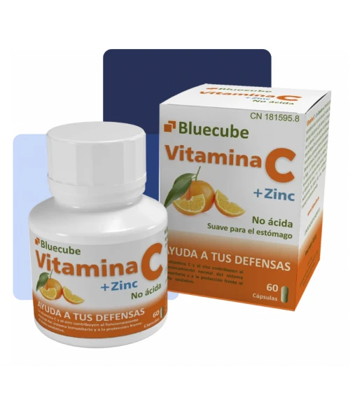 Compra Bluecube Vitaminas C D Zinc 60 Cápsulas en Farmacia Vizcaíno, tu farmacia online de confianza, y benefíciate de envíos rápidos en 24/48 horas y envío gratuito a partir de compras de 65€.