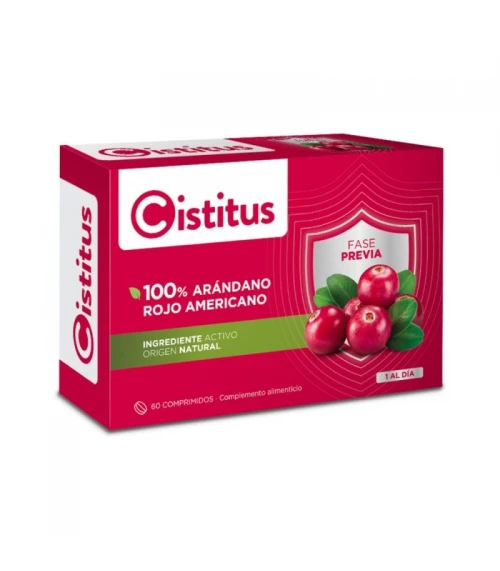 ACCIÓN Y DESCRIPCIÓN El malestar del tracto urinario puede estar causado habitualmente por la bacteria Escherichia coli procedente del intestino, su hábitat natural. Cuando dichas bacterias, que se alojan en el intestino, consiguen llegar a la uretra y a la vejiga, pueden establecerse y producir molestias. Las mujeres tienden a padecerlo con mayor frecuencia que los hombres, debido a que anatómicamente su uretra tiene un recorrido más corto. Cistitus es la gama de productos a base de Arándano Rojo Americano, con una alta concentración de proantocianidinas (PACs). * Es un complemento alimenticio para tomar de manera periódica. * Modo de empleo: • Se recomienda tomar 1 comprimido al día, preferentemente antes de acostarse y durante un mínimo de 1 mes. • Es aconsejable repetir la toma de Cistitus® 3 o 4 veces al año. • En mujeres se recomienda una toma postcoital adicional. * Apto en embarazadas y niños. * Se desconocen efectos adversos. * NO es recomendable tomar Cistitus® comprimidos: • Con el uso de anticoagulantes orales. • En personas diabéticas. • En personas con tendencia a padecer nefrolitiasis (formación de piedras en el riñón). ANÁLISIS MEDIO Por comprimido: Proteínas: 1,8 mg Hidratos de carbono: 18 mg Lípidos: 3 mg ENERGÍA 1,53 kcal / 6,32 kJ INGREDIENTES Por comprimido: Extracto de Arándano Rojo Americano (Vaccinium macrocarpon) (191 mg) (con 130 mg de proantocianidinas (PAC)), celulosa microcristalina (estabilizante), carboximetilcelulosa (estabilizante), dióxido de silicio(antiaglomerante), hidroxipropilmetilcelulosa (estabilizante), polidextrosa (estabilizante), dióxido de titanio (colorante), óxido de hierro (colorante), talco (antiaglomerante), maltodextrina (soporte), triglicéridos de cadena media (estabilizante), riboflavina (estabilizante), ácido carmínico (estabilizante). MODO DE EMPLEO Tomar 1 comprimido al día. USO EN PACIENTES CON INTOLERANCIA ALIMENTARIA Este producto lo puede tomar una persona celíaca, alérgica/intolerante al huevo, alérgica a la proteína de leche o intolerante a la lactosa.