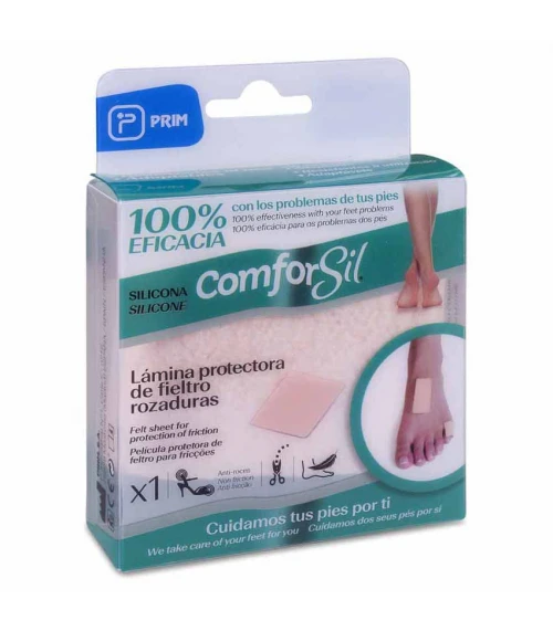 La Comforsil Lámina de Fieltro Recortable Protectora Adhesiva 22 cm x 7 cm 1 unidad CC249 es un producto versátil que ofrece alivio efectivo contra rozaduras y presión en la piel. Su diseño permite cortar y adaptar la lámina fácilmente a la zona deseada, proporcionando una protección superior en áreas sensibles, como pies y dedos, previniendo así la formación de ampollas.