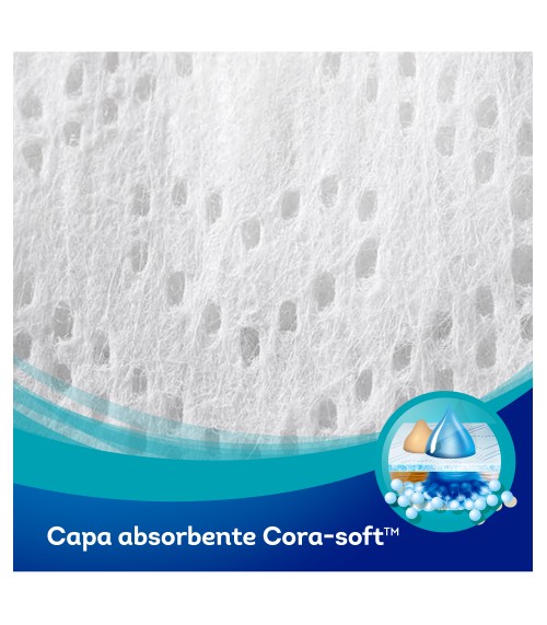 Su capa absorvente Cora-Soft ofrece la máxima absorción de Dodot a la vez que cuida la piel del bebé con total delicadeza.