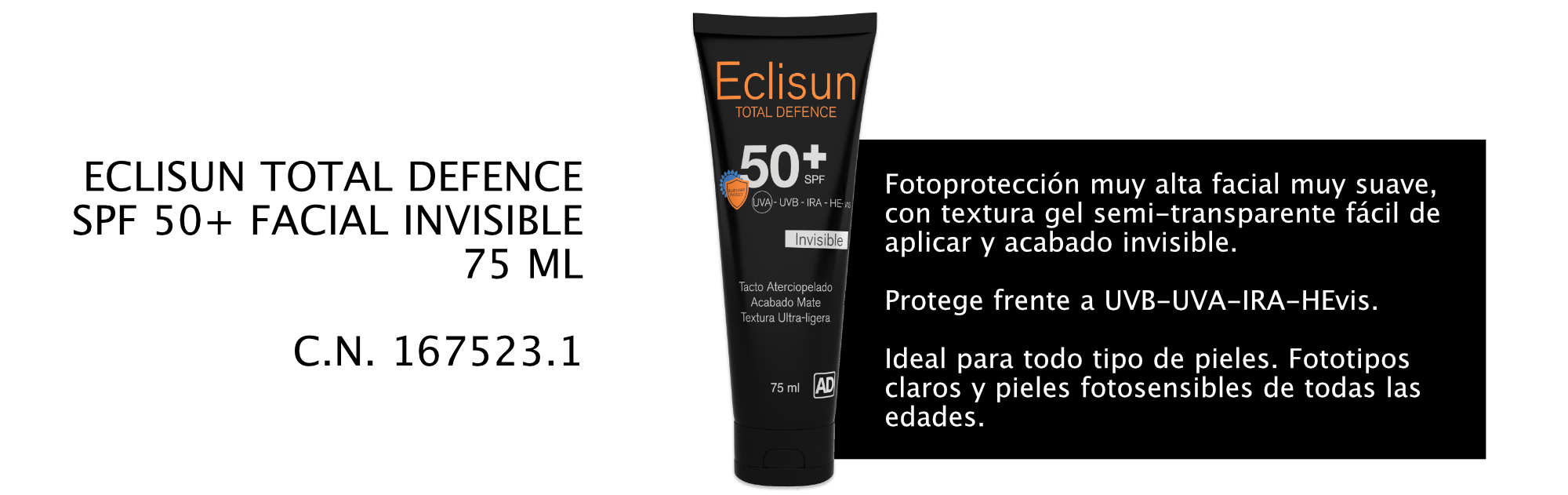 Eclisun Total Defence SPF50+ Invisible 75 ml ha sido formulado sin parabenos, es resistente al agua, no comedogénico y está indicado para todas las edades y tipos de piel e incluso fototipos.