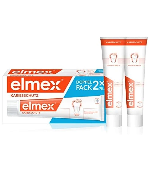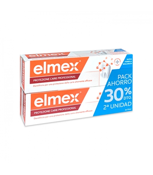 ELMEX DUPLO PROTECCIÓN CARIES PROFESIONAL se comercializa en un envase exclusivo de 2 tubos de 75 ml cada uno, diseñados para ofrecer dos paquetes con un formato optimizado para el uso prolongado. El pack dúo es ideal para el hogar y ofrece una relación calidad–precio muy competitiva.