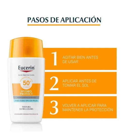 Para beneficiarte al máximo de este producto, aplica EUCERIN SUN HYDROPROTECT FLUIDO ULTRA LIGHT SPF50 50 ML TONO MEDIO generosamente sobre tu rostro limpio, antes de la exposición solar. Asegúrate de aplicarlo de manera uniforme y recuerda reaplicarlo cada dos horas, especialmente después de nadar, sudar o secarte con una toalla. Su textura ligera se funde con la piel sin esfuerzo, haciendo su aplicación totalmente práctica.