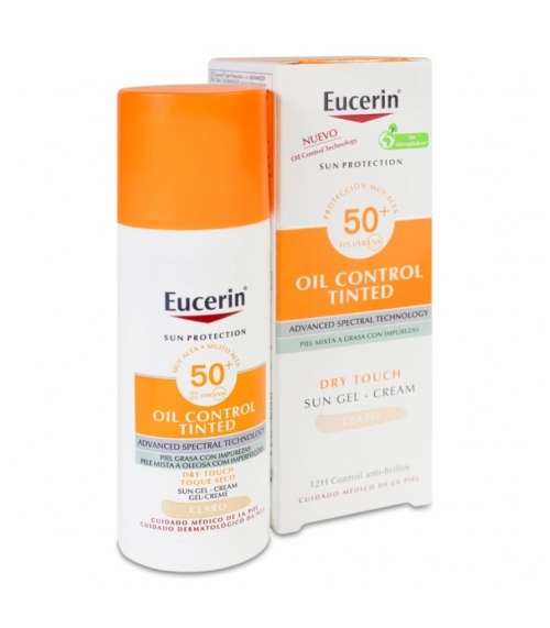 Eucerin Sun Oil Control SPF50 Gel-Crema 50 ml Tono Claro es un protector solar facial de alta protección diseñado para pieles grasas y con tendencia acneica. Este gel-crema proporciona una excelente defensa contra los dañinos rayos UVA y UVB, ayudando a prevenir el envejecimiento prematuro de la piel. Su innovadora textura ligera y no grasa minimiza los brillos, garantizando un acabado mate y uniforme. Además, el tono claro se adapta a tu piel, unificando tu color natural y aportando una cobertura ligera.