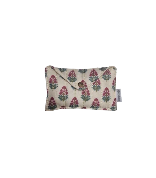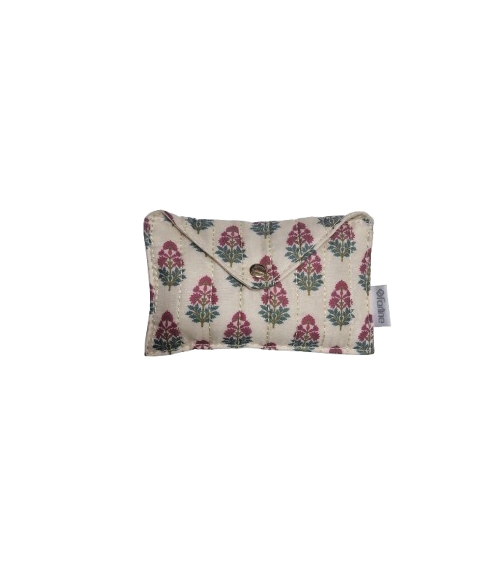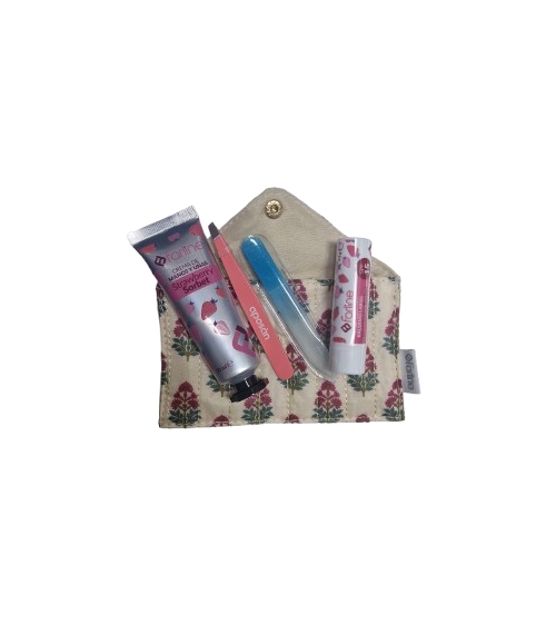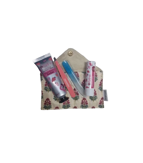Monedero de tela con cierre que contiene un kit para llevar siempre en el bolso. Contiene una lima de uñas, pinzas de depilar, crema de manos y stick labial.