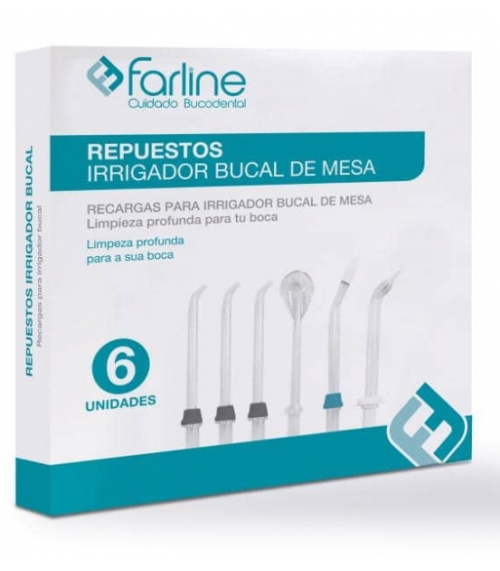 Farline Repuestos Irrigador de Mesa 6 Unidades son accesorios esenciales para mantener tu higiene bucal óptima. Estos repuestos están diseñados para usarse con tu irrigador dental de mesa, garantizando una limpieza profunda y efectiva de los espacios interdentales. A través de un potente chorro de agua, eliminan los restos de comida y la placa dental que el cepillado convencional no consigue retirar. ¿Buscas mantener tus encías saludables y tu sonrisa radiante?