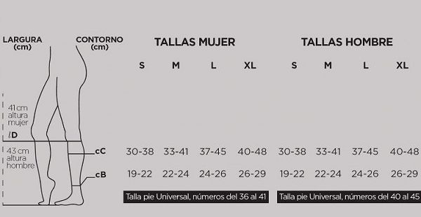 Para elegir la talla debemos medirnos el contorno de la pantorrilla, del tobillo y la altura desde el suelo, descalzos, hasta justo debajo de la rodilla. Con esas tres medidas, nos vamos a la tabla y elegimos la talla más apropiada. En caso de duda, consúltenos ya que estos productos, por motivos de higiene, no tienen devolución.