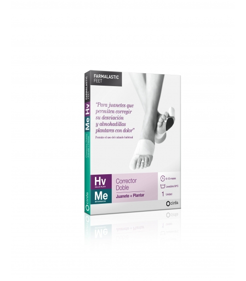 Es un sistema de sujeción para corregir y limitar la evolución del juanete (Hallux Valgus), aliviando los dolores articulares y los ocasionados por el roce. Su función es evitar y aliviar los dolores plantares del antepié debidos a envejecimiento o desgaste de la almohadilla plantar natural del pie, durezas, etc. El corrector doble patentado, a diferencia de los correctores rígidos, se utiliza durante la jornada gracias a su diseño flexible y ultrafino. Realinea el 1er dedo del pie de forma regulable y también el 1er metatarsiano, a la vez que ayuda a aliviar el dolor, tanto articular como por roce en el juanete y la zona metatarsiana. Llevándolo a diario con cualquier tipo de calzado, no sólo corrige y ayuda a aliviar el dolor, también limita la progresión del juanete.¿QUÉ CARACTERÍSTICAS TIENE?