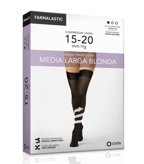FARMALASTIC MEDIA LARGA (A-F) COMPRESION LIGERA BLONDA TALLA S COLOR NEGRO es un dispositivo médico de compresión graduada clase I diseñado para la recuperación y el confort diario de las piernas. Su confección con hilos de alta calidad en poliamida y elastano proporciona una presión ligera que favorece la circulación venosa, ayudando a minimizar la sensación de piernas cansadas y pesadez. Está indicado para personas que permanecen mucho tiempo de pie o sentadas, así como para aquellos con tendencia a la hinchazón leve de tobillos y pies.