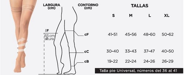 Si hay dudas entre dos tallas se recomienda elegir la más grande ya que la pequeña puede acabar generando dos problemas: que no entre por el tobillo y se rompa o no se pueda poner o que ajuste demasiado en la pantorrilla o el muslo y ocasione problemas de circulación más graves que los que viene a solucionar. En caso de más dudas, llámenos al 959550055.