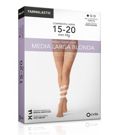 FARMALASTIC MEDIA LARGA (A-F) COMPRESIÓN LIGERA BLONDA TALLA XL COLOR CAMELse presenta en un par de medias long leg (altura muslo) con compresión ligera y graduada. Material: 78 % poliamida y 22 % elastano. Paquete individual sellado, con instrucciones de uso y ficha técnica.