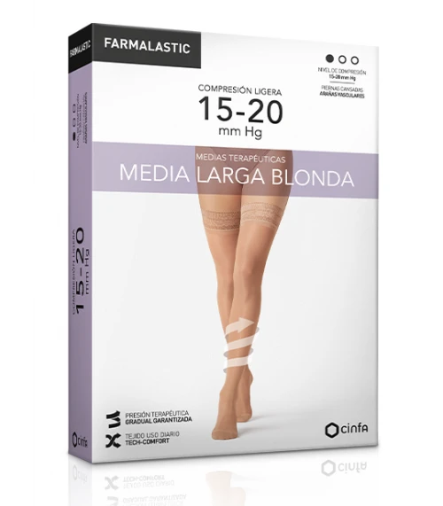 Desde Farmacia Vizcaíno recomendamos combinar FARMALASTIC MEDIA LARGA (A-F) COMPRESIÓN LIGERA BLONDA TALLA XL COLOR CAMEL con hábitos de vida saludables, como elevar las piernas unos minutos al día y realizar caminatas suaves. Una correcta hidratación y descansos periódicos potencían la sensación de bienestar en las piernas. Para ajustarla adecuadamente, recurra a un calzador específico si lo necesita y evite uñas largas o anillos que puedan dañar el tejido.