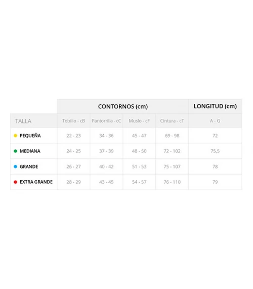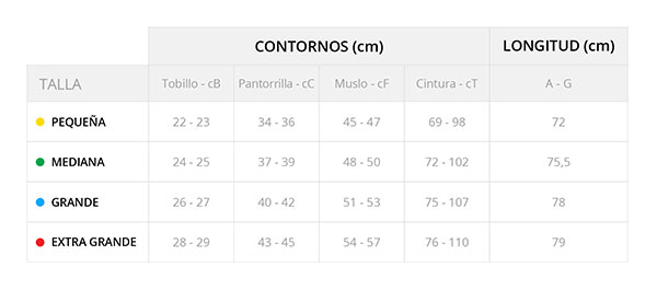 Hay que buscar la que más se adapte a las 4 medidas que tomaremos en:TOBILLO - PANTORRILLA - MUSLO - CINTURA