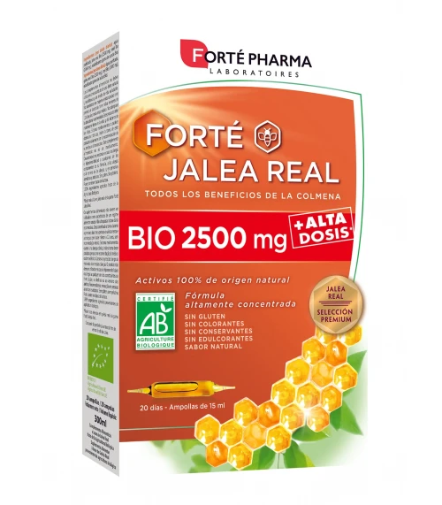 Forté Jalea Real BIO 2500mg es la solución a base de ingredientes de origen natural para aportar los beneficios de la jalea real a nuestro organismo. Su fórmula ultra-concentrada y ultra-dosificada asocia dos activos naturales: - La Jalea Real: fruto de la alquimia entre el trabajo de las abejas y el mundo vegetal, la jalea real es un concentrado nutritivo destinado a alimentar a la reina, aportándole una increíble longevidad. - La Miel: sustancia producida por las abejas a partir del néctar o mielato, la miel es conocida desde la antigüedad por sus múltiples virtudes.