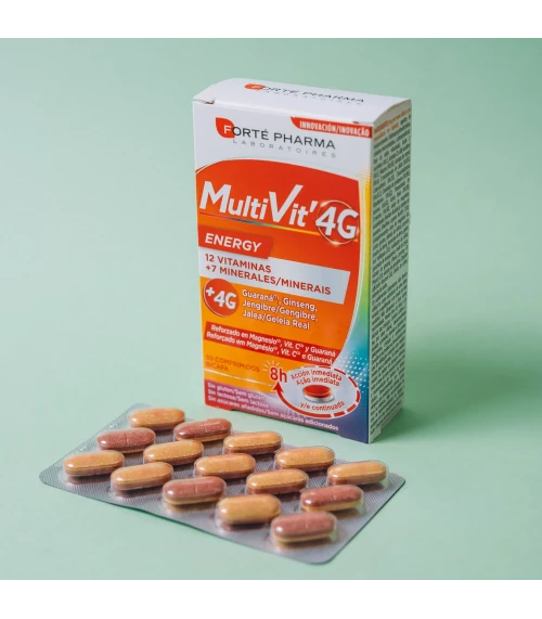 Se trata de un complemento alimenticio que ayuda a reducir el cansancio y la fatiga y contribuye al estado de vigilia. Su fórmula completa de Multivit 4G Energy 30 Comprimidos incluye:- 12 Vitaminas, con dosis del 100% mínimo de los valores nutricionales recomendados,- 7 Minerales, esenciales para el buen funcionamiento de nuestro organismo- El complejo 4G: Ginseng, Guaraná, Jalea Real y Jengibre.