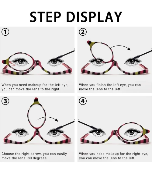 Para utilizar las gafas, simplemente colócalas sobre tu nariz como lo harías con unas gafas de lectura normales. Ajusta el lente giratorio para maquillar un ojo a la vez, moviéndolo cuando necesites cambiar de ojo. Asegúrate de estar en un entorno bien iluminado para obtener los mejores resultados. Una vez terminado el maquillaje, limpia las lentes con un paño suave para mantenerlas en perfecto estado.