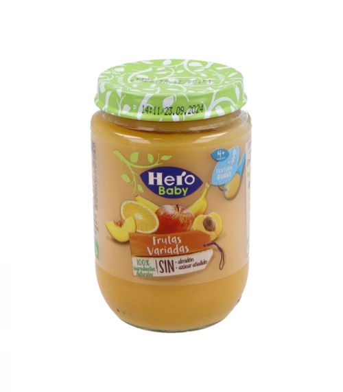 Hero Baby Frutas Variadas 1 Tarro 190 g viene en un práctico frasco de vidrio de 190 gramos, diseñado para conservar la frescura y el sabor durante más tiempo. Su tamaño es perfecto para alimentar a tu bebé en casa o en cualquier lugar, siendo una opción práctica para padres ocupados.