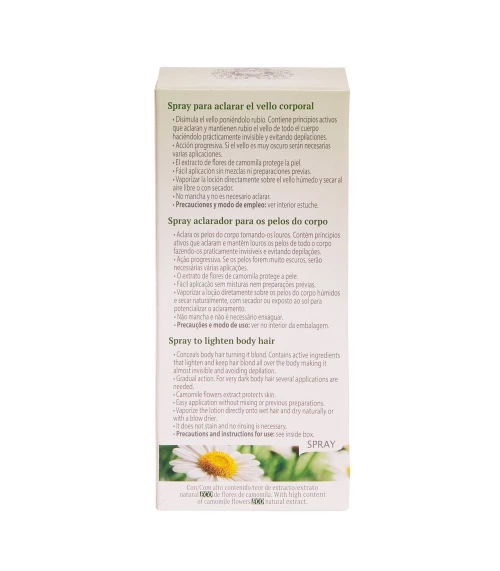 Instrucciones de uso Para que el producto sea más eficaz, humedezca con agua templada la zona que desee tratar, quite el exceso de agua con una toalla, aplique el spray directamente haciendo un suave masaje con la mano y déjelo actuar durante unos minutos. No es necesario aclarar después. Consejos La luz solar o el uso de un secador favorece la actuación del producto y aclara más rápidamente el vello. El producto al ser de base natural irá aclarando el vello gradualmente en varias aplicaciones dependiendo del color y fortaleza del vello, por ello es recomendable aplicar el producto al principio 2 veces al día hasta que el vello quede aclarado y disimulado. Una vez aclarado bastarán 1 o 2 aplicaciones semanales para mantenerlo. Características Es la fórmula más potente • Contiene principios activos extraídos de las flores de manzanilla que aclaran el vello y protegen la piel • Aplicación directa con spray sin mezclas • Acción progresiva • No contiene amoniaco, ni tintes químicos • Fórmula desarrollada y comprobada por farmacéuticos • No contiene siliconas ni parabenos • No testado en animales PRECAUCIONES Evite que el producto entre en contacto con los ojos. Si esto ocurriera lavar con abundante agua. Por su composición es muy improbable que se produzcan alergias. Si tiene dudas, es recomendable hacer una prueba previa poniendo una pequeña cantidad sobre la piel de la parte interior de su muñeca. Si después de 12 horas no hay reacciones, puede usarlo con confianza. No lo use para aclarar las cejas y pestañas. Evite rociar el spray sobre la cara. Para la cara y zonas delicadas empape un algodón con el producto y aplique directamente con un suave masaje. Proteger el frasco de luz y altas temperaturas (superiores a 40° C). Mantenga el producto fuera del alcance de los niños.