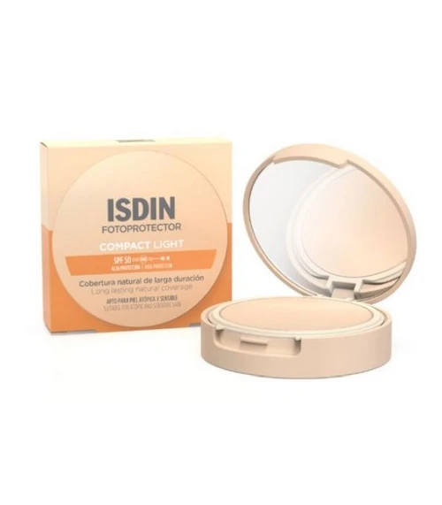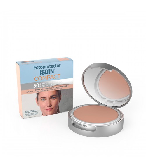 Fotoprotector ISDIN Compact SPF50+ en maquillaje de uso diario.