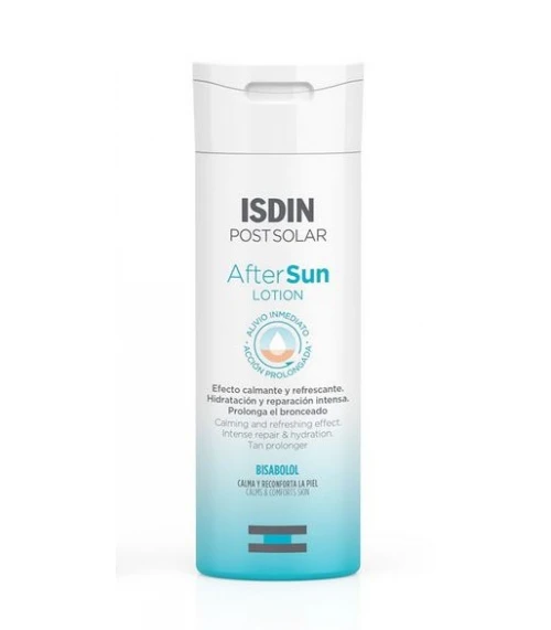 La composición de cada envase de Isdin After Sun Lotion 200 ml es la siguiente: Aqua (Water), Alcohol Denat., Octyldodecanol, Cetyl Alcohol, Isopropyl Palmitate, Polysorbate 60, Dimethicone, Ethylhexyl Methoxycinnamate, Propylene Glycol, Benzyl Alcohol, Carbomer, Sorbitan Stearate, Allantoin, Sodium Hydroxide, Bisabolol, Disodium EDTA, Parfum (Fragrance), Menthol, BHT, Linalool, Citronellol, Chamomilla Recutita (Matricaria) Flower Extract, Geraniol, Limonene, Silica.