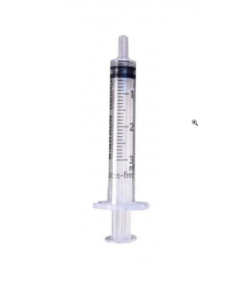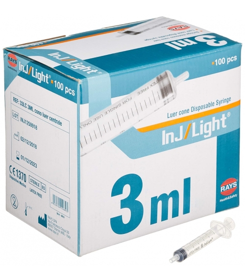 Jeringa de 3 cuerpos con cono Luer céntrico. 3 ml de capacidad.
