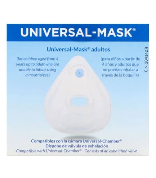 La mascarilla para adultos: para niños a partir de 4 años y adultos que no pueden inhalar a través de la boquilla. En realidad es útil para todo el mundo ya que los porcentajes de absorción de medicamentos aumentan en todos los casos en los que se administra un medicamento pro vía inhalatoria con cámara+mascarilla vs cuando se administra sin estos dispositivos espaciadores. En el caso de personas mayores o con falta de coordinación motora o de niños pequeños, es prácticamente imprescindible su uso si queremos que el medicamento haga su función.