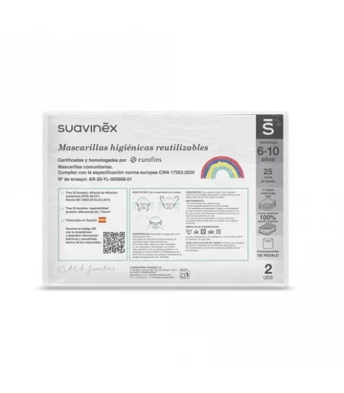 Opción ideal: A nivel medioambiental, porque al ser reutilizables evitamos generar más deshechos de la cuenta. A nivel salud, porque al ser reutilizables ayudamos a evitar que se conviertan en posible vector de contagio y, con ello, en un problema para la salud social. A nivel económico porque el coste/uso por unidad es muy bajo. 4 capas de protección: algodón - TNT (tejido no tejido) - TNT (tejido no tejido) - algodón. Eficacia de filtración bacteriana (BFE): en origen 80,53%, y 88,22% tras 25 lavados; respirabilidad (presión diferencial): en origen 43,7 Pa/cm2, < 50,1 Pa/cm2 tras 25 lavados. Según la norma 14683:2019 + AC:2019 tras 25 ciclos de lavado. Ensayada: En eficacia de filtración bacteriana. En transpirabilidad. En nº de lavados y teniendo en cuenta estos 3 parámetros: - tejido - confección - decoración/ impresión. Nº ensayo: AR-20-YL-005808-01? Reutilizables hasta 25 lavados, 25 lavados = 25 usos (Según el Ministerio de Sanidad 1 uso = 4 horas*). Pruebas de lavado de acuerdo a la norma UNE-EN ISO 6330:2012*. *Según recomendaciones del Ministerio de Sanidad: Ver recomendaciones en el ámbito comunitario