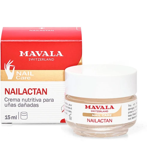 Mavala Nailactán Crema nutritiva Uñas 15 ml Tarro es una crema para las uñas dañadas, secas, quebradizas y frágiles, compuestas de aminoácidos esenciales, lípidos y vitaminas quero-reguladoras y fortificantes. Su acción nutritiva e hidratante reestablece la elasticidad de la superficie de la uña, mejora su estado general y la refuerza ante la rotura.