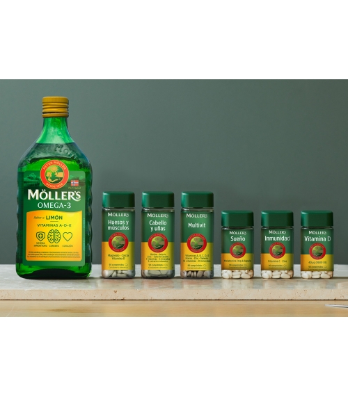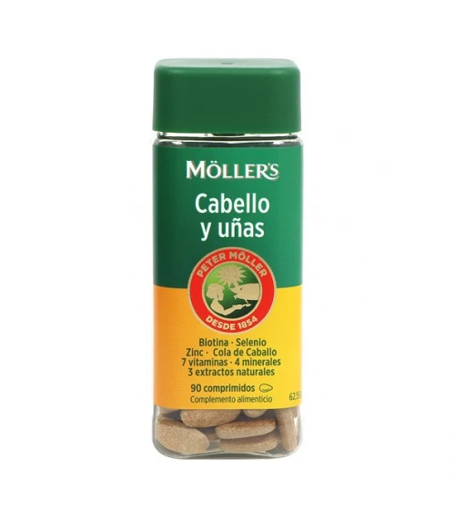 **Möller's Cabello y Uñas 90 Comprimidos** es un complemento alimenticio diseñado para fortalecer y revitalizar tanto tu cabello como tus uñas. Formulado con nutrientes esenciales como biotina, zinc y vitamina E, este producto apoya el crecimiento saludable, incrementando la resistencia y el brillo natural del cabello y fortaleciendo las uñas, ayudando a prevenir la fragilidad y rotura.