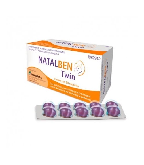 Natalben Twin es un complemento nutricional que ayuda a cubrir las necesidades nutricionales de la mujer durante todo el embarazo múltiple en caso de que la dieta no pueda conseguirlo porque no se puedan tomar ciertos grupos de alimentos. Su composición está estudiada para que cualquir nutriente básico que necesitemos se vea completado.