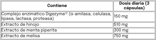 Contiene enzimas amilasa, celulasa, lipasa, lactasa, proteasa + extractos vegetales de melisa, menta e hinojo.