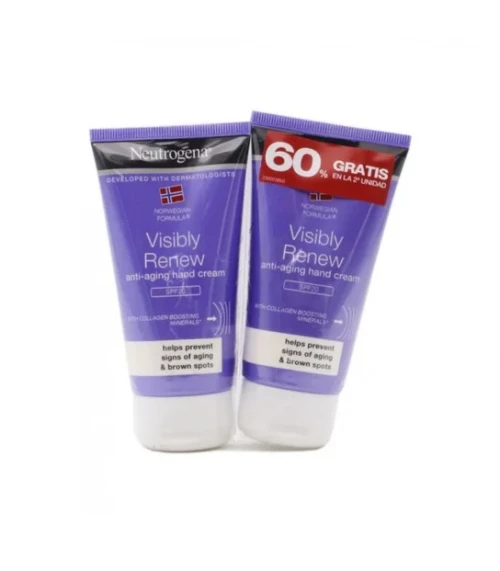 Es una crema de manos con efecto antiedad y una ligera protección solar de SPF20. Contiene minerales activos que estimulan la producción de colágeno por parte del propio cuerpo. Neutrogena Manos Visibly Renew Duplo 75 + 75 ml proporciona una hidratación en profundidad sin dejar residuos grasos en las manos, combatiendo de forma eficaz los signos del envejecimiento y previniendo la aparición de manchas en la piel.