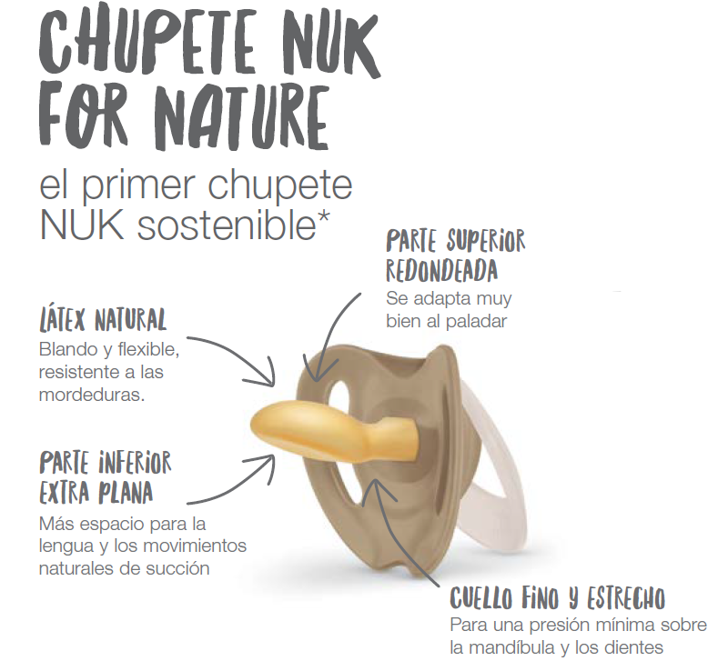 Chupete inspirado en la naturaleza, a la que intenta cuidar a base de utilizar materiales sostenibles*, envases reciclados y reciclables, huella de carbono neutra o lo más baja posible y todo ellos sin renunciar a la calidad Nuk.
