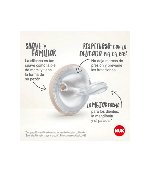 Chupete de silicona con el diseño creado por Nuk de Mommy Feel, para interferir lo mínimo posible con la lactancia, dejándola intacta.