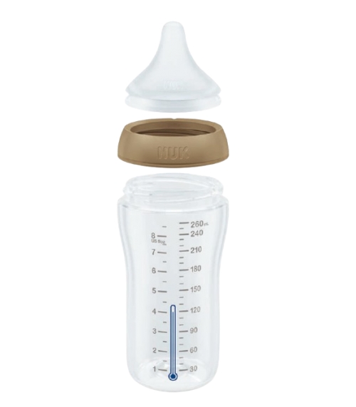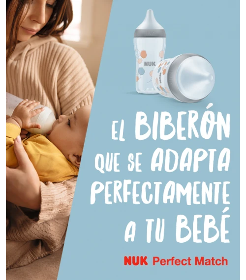 Se trata de un biberón de Nuk con tetina de silicona adaptable a la presión que el bebé hace en el momento de succionar por lo que se asemeja más al pezón materno. La tetina es de flujo medio, suave y elástica.