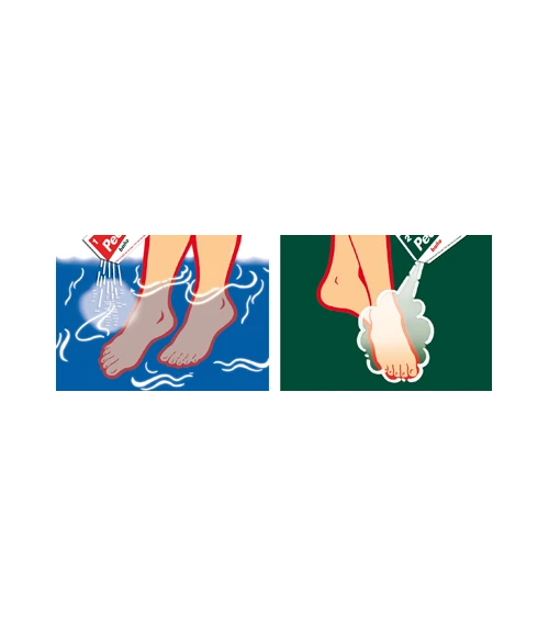 MODO DE EMPLEODisolver el polvo del sobre 1, en un recipiente con 4-5 litros de agua tibia y mantener los pies sumergidos unos 5 min.