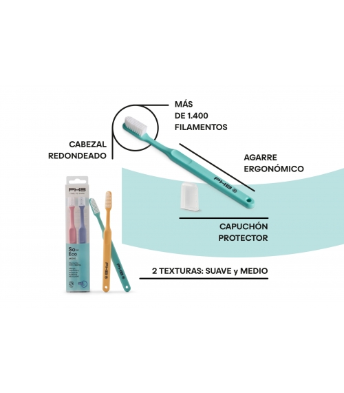 Es el nuevo cepillo de dientes de PHB. Sale al mercado en la primavera de 2024 y representa lo nuevo de PHB, de la mano de Dentaid. Es un cepillo de dientes que lo hay en dos presentaciones: suave y medio. Vienen 4 colores diferentes inspirados en la naturaleza y se vende de dos en dos.