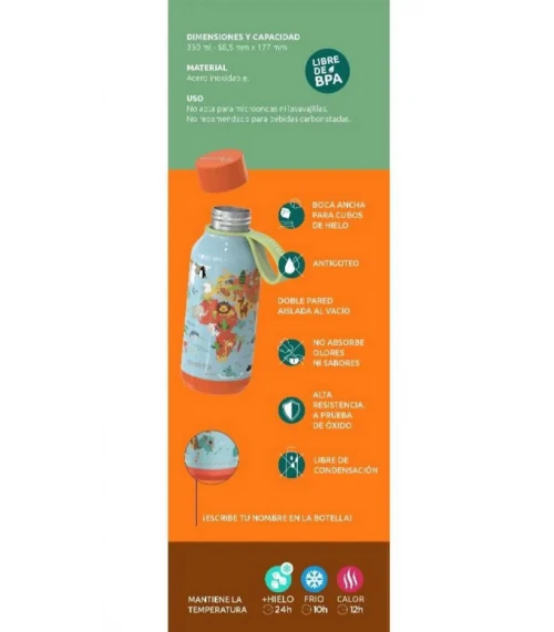 Se trata de una botella de acero inoxidable decorada por fuera. Mantiene la temperatura, tanto frío como caliente durante horas. Está hecha de acero inoxidable y, por supuesto, libre de BPA.¿QUÉ CARACTERÍSTICAS TIENE?