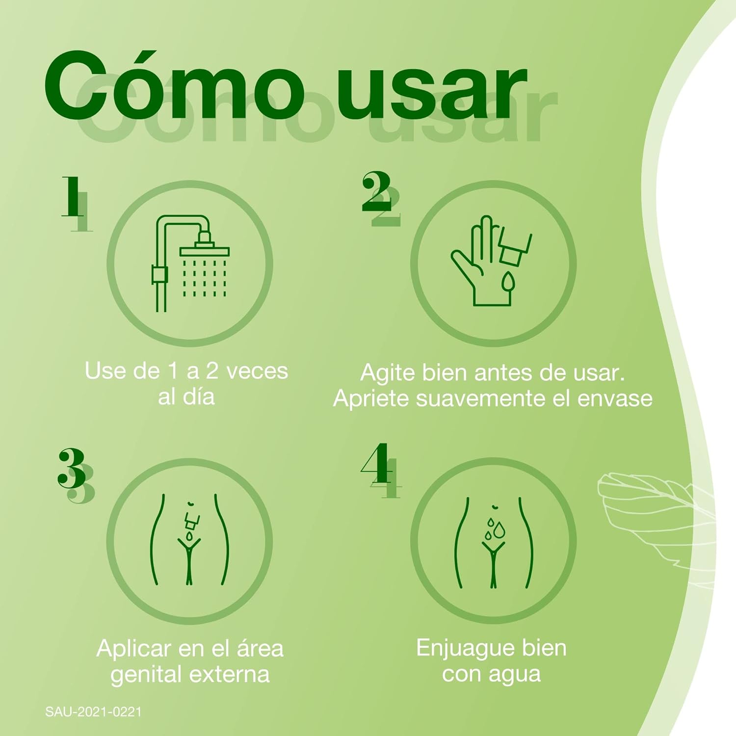 Para obtener los mejores resultados, utiliza el jabón íntimo durante la ducha diaria. Aplica una pequeña cantidad del producto en la mano y distribúyelo suavemente sobre la zona íntima externa. Enjuaga con abundante agua y seca cuidadosamente. Es un producto diseñado para el uso externo, por lo que debe evitarse el contacto con los ojos y no debe ser ingerido.