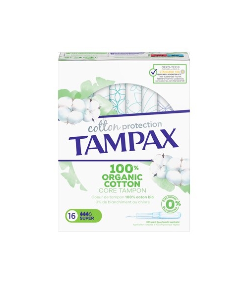 ¿QUÉ ES Y PARA QUÉ SIRVE TAMPAX COTTON PROTECTION 16 UNIDADES SUPER? Los tampones orgánicos Tampax Cotton Protection 16 unidades Super están fabricados con un núcleo 100% de algodón orgánico. 0% de perfume, colorante & blanqueamiento con cloro. Su aplicador está hecho con 90% de plástico vegetal y su punta redondeada facilita la inserción. Tampax Cotton Protection 16 Unidades Super con tecnología MotionFit se expande con suavidad para adaptarse a la forma de tu cuerpo. También cuenta con protección LEAKGUARD BRAID, una trenza para evitar que se produzcan fugas. Tampax Cotton Protection Regular es para escaso a normal para adaptarse a tu flujo. Los tampones Tampax Cotton Protection están ginecológicamente testados. También han sido sometidos a un análisis independiente de sustancias nocivas por OEKO-TEX STANDARD 100. PRECAUCIONES Y ADVERTENCIAS El uso de tampones está asociado una enfermedad poco frecuente pero grave denominada Síndrome del Shock Tóxico (SST). SST es una enfermedad muy poco frecuente aunque grave. Está causada por unas toxinas producidas por la bacteria Staphylococcus Aureus, que normalmente se encuentra en la nariz ay en la vagina. El SST es una enfermedad conocida y tratable que pueden sufrir los hombres, las mujeres y los niños. Es más probable que ocurra en chicas adolescentes y mujeres menores de 30 años (SST menstrual). Aunque es poco frecuente, es importante conocerlo para actuar en caso necesario. Un reconocimiento y tratamiento temprano de los síntomas es primordial. Los signos que advierten de un posible SST son los siguientes, aunque no tienen por qué presentarse todos ellos: alta fiebre súbita (39ºC o más), mareos, vómitos, dolor muscular, diarrea, desmayos o sensación de desmayo al ponerse en pie e irritaciones cutáneas similares a quemaduras solares. En estados avanzados de la enfermedad, la piel puede descamarse. El SST puede presentarse en cualquier momento durante la menstruación o poco después. Puede pasar fácilmente de unos síntomas similares a los de la gripe, a convertirse en una enfermedad grave de consecuencias fatales. Si tienes uno o más de estos síntomas, debes quitarte el tampón inmediatamente y buscar atención médica. Dile a tu doctor que has usado tampones y te preocupa poder tener SST. Si has tenido síntomas de SST en anteriores ocasiones, deberías consultar a tu médico antes de usar tampones. Puedes reducir el riesgo de SST usando la mínima absorción necesaria para cubrir tus necesidades, cambiando el tampón cada 4/8 horas y usando una compresa en lugar de un tampón al menos una vez al día durante tu regla. También se puede eliminar prácticamente el riesgo de SST menstrual no usando tampones. Se recomienda usar siempre la presentacion de la mínima absorción en funcion del flujo personal. Cambiar de tampón cada 4/8 horas.