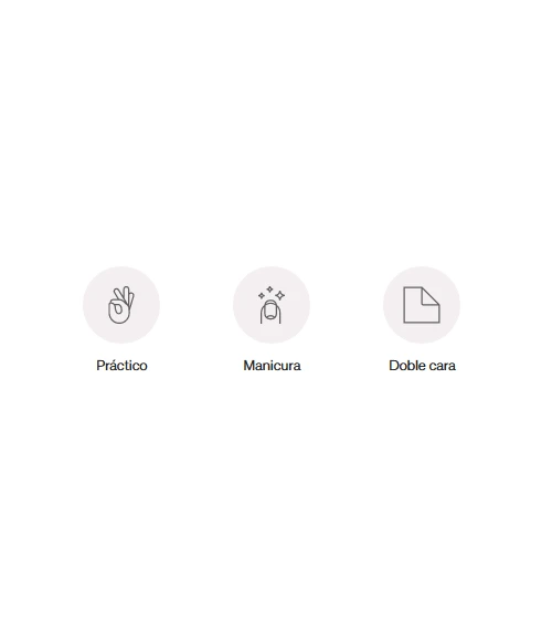 Es una lima de uñas con dos caras,una más rugosa y áspera que la otra. Con una da forma y redondea la uña y la otra pule su superficie, dejando las uñas perfectas, incluso cuando queremos prepararlas para aplicar el esmalte y que tenga la mayor durabilidad.