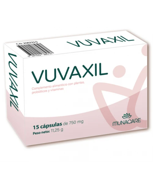 VUVAXIL 15 Cápsulas es un complemento alimenticio diseñado para ayudar a mitigar los efectos de la vulvovaginitis y, además, promover su curación. Contiene vitaminas, probióticos y extractos vegetales ue tienen como objetivo mejorar el estado general, ayudando a calmar el picor, escozor e inflamación.